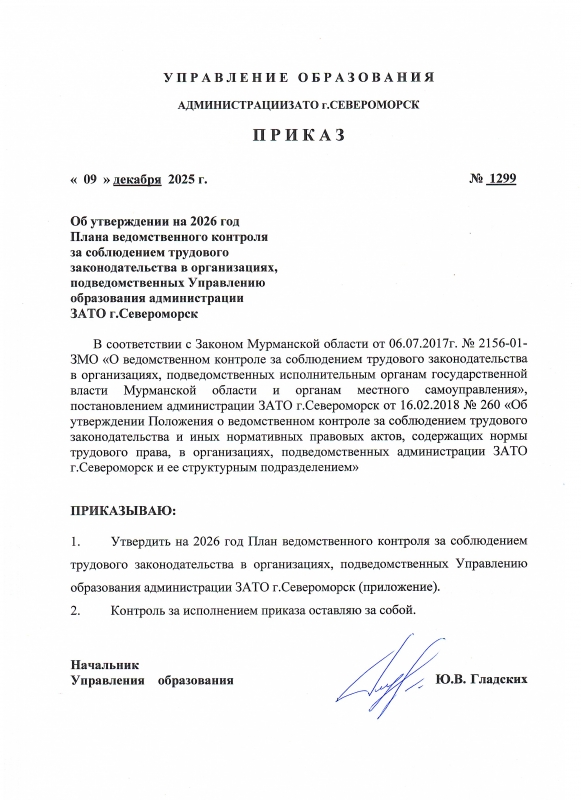 Приказ управления образования администрации ЗАТО г. Североморск от 09 декабря 2025 г. №1299 "Об утверждении на 2026 год Плана ведомственного контроля за соблюдением трудового законодательствав организациях, подведомственных Управлению образования администрации ЗАТО г.Североморск". Приложение.